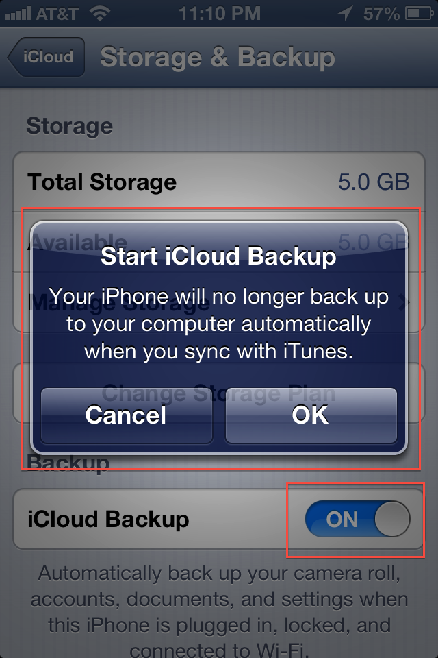 5. Check that iCloud Backup toggle is set to On. As soon as you turn it ON, it will show up a message saying “Your iPhone will no longer back up to your computer automatically when you sync with iTunes”. You will have to click “Yes” if you want to continue with you iCloud Backup. If you tap “Cancel” you wont be able to continue with your iCloud’s backup.