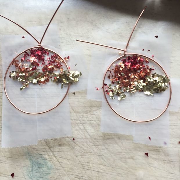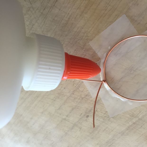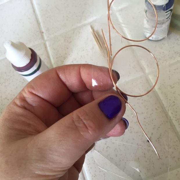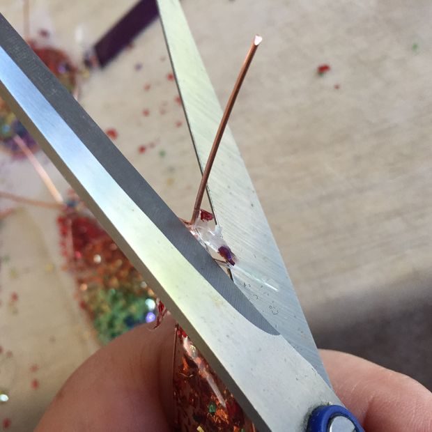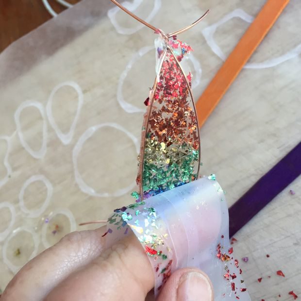 Clear epoxy resin, glitter, Elmer’s glue, Scotch tape, Popsicle sticks for mixing and copper wire.