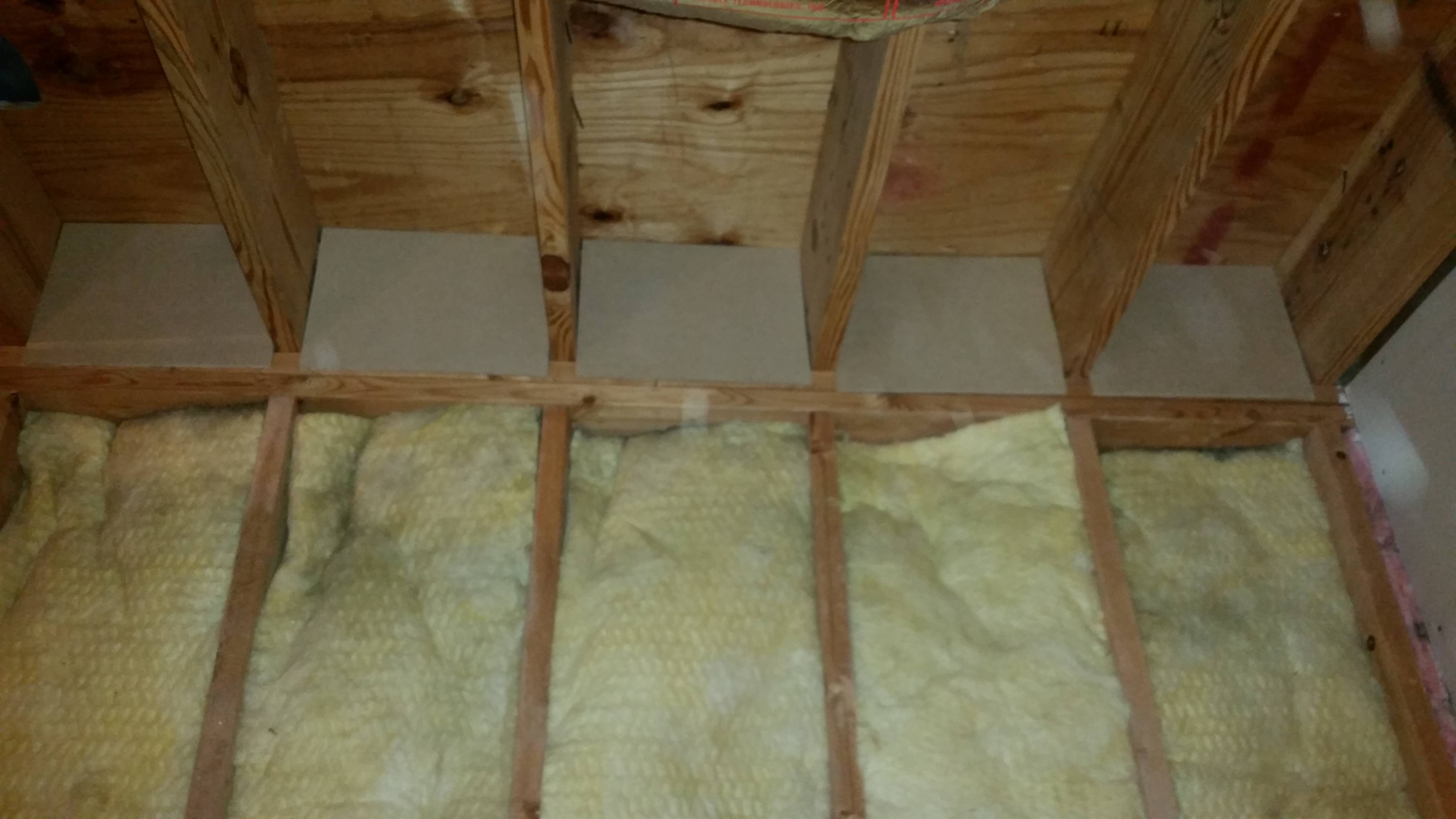 She covers the wall gaps between the joists using a thin, scorable particle board and used nail gun to keep it in place.